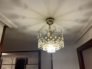 Lámpara colgante tipo araña de estilo clásico y elegante. Estructura metálica en tono dorado con detalles ornamentales y colgantes de cristal que aportan una iluminación cálida y sofisticada. Ideal para salón, comedor o entrada. -Usa 7 bombillas tipo vela (incluidas) -En muy buen estado y funcionando perfectamente -Diseño atemporal y decorativo -Altura: 94cm -Diámetro: 58cm Se vende por cambio de decoración. Precio: 120 € Recogida: en mano. Interesados/as, contactar sin compromiso.