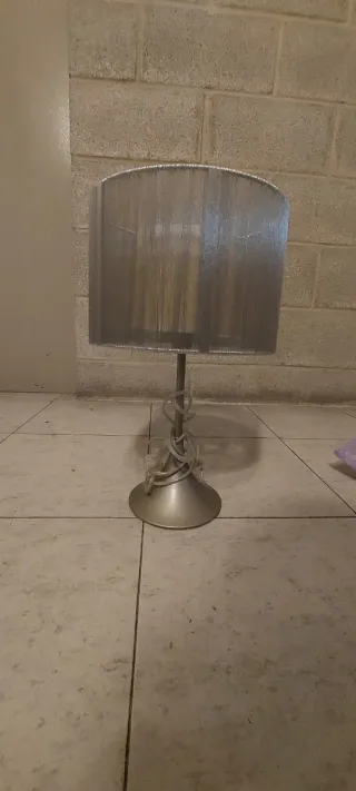 Elegante lámpara de mesilla con un diseño moderno. - Acabado en tono plateado. - Pantalla de tela. - Base y pie de metal.