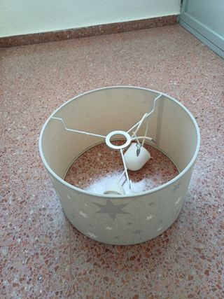 Bonita lámpara infantil con estampado de estrellas. Ideal para dormitorio infantil. - Pantalla de tela en tonos beige y gris. - Incluye bombilla y accesorios para su instalación.