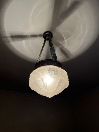 Preciosa lampara de techo antigua de estilo clásico. Ideal para dar un toque vintage a tu hogar. - Elegante diseño con detalles dorados. - Fabricada en metal y cristal. - Presenta un estado antiguo, con señales del paso del tiempo que le dan encanto. 25 euros cada una