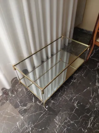 Elegante mesa de centro con un diseño moderno y sofisticado. - Combinación de metacrilato transparente y detalles metálicos dorados. - Superficie de espejo que aporta luminosidad y amplitud. - Estructura robusta y estilizada. A recoger en Jaen capital.