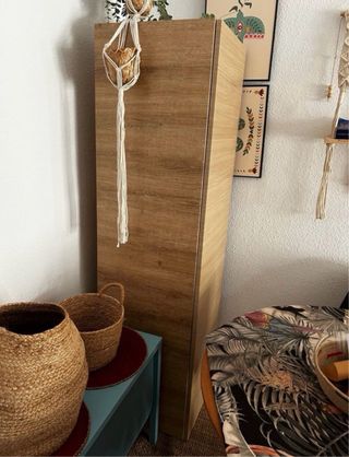 Estantería alta con un diseño moderno y funcional. Ideal para organizar tus pertenencias. • Acabado en madera clara. • Puerta de apertura lateral. • Múltiples baldas interiores. Medidas: Fondo 46cm (sin puerta) y 18cm con puerta Ancho 45cm Alto 173cm 5 estantes, 6 huecos