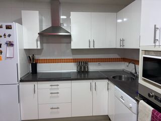 Conjunto de cocina con acabados en blanco y detalles plateados. - Muebles de cocina con puertas y cajones. - Fregadero de acero inoxidable + grifo - Encimera oscura. No incluye lavavajillas ni nevera. Campana extractora y microondas se vende aparte. Pack completo: cocina + campana + microondas = 450€ Preguntar mas detalles de medidas. Marca campana: Eurodomo (Leroy Merlin) Marca microondas: Corberó Se puede ver sin compromiso y no incluye transporte ni montaje ni desmontaje.