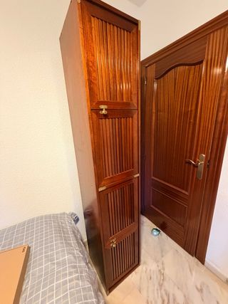 Mueble estantería / armario auxiliar de madera maciza Se vende mueble estantería alto de madera, muy sólido y de buena calidad, con acabado en tono nogal y puertas con diseño clásico. Ideal para dormitorio, despacho, recibidor o trastero. ✔️ Muy robusto y estable ✔️ Gran capacidad de almacenaje ✔️ Puertas con cierres metálicos ✔️ Se puede venir a ver sin ningún problema El mueble está en buen estado general y también es perfecto para restaurar, pintar o adaptar a tu gusto, ya que la madera es de calidad y admite muy bien cualquier cambio. Medidas: • Fondo: 40 cm • Alto: 40 cm • Ancho: 204 cm 📍 Recogida en mano