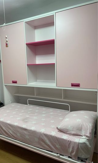 Cama abatible con un diseño moderno y funcional. - Estructura principal en color blanco. - Puertas y detalles en color rosa. Esta en muy buen estado como se ve en las fotos, ha tenido poco uso. Se vende sin colchon No se hacen envios