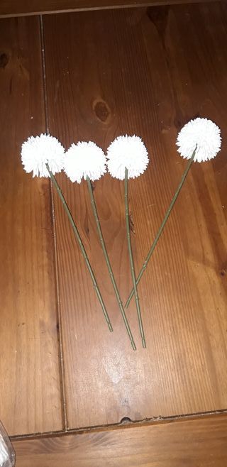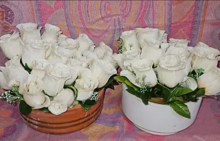 Conjunto de flores artificiales decorativas, perfectas para añadir un toque de color y frescura a cualquier espacio. - Flores de color blanco. - Hojas y tallos de color verde. - Maceta de terracota con detalles. - Maceta blanca de diseño moderno. Lo puedo acercar a Ávila, Escorial, Villalba o Madrid o zonas cercanas. Preguntar