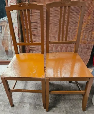 Dos sillas de madera, perfectas para dar un toque rústico a tu hogar. - Asientos pintados en color naranja. - Respaldo con diseño clásico. Para restaurar