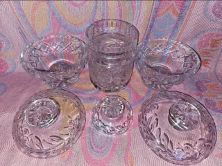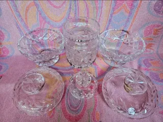 Elegante set de tres piezas de cristal tallado con un diseño intrincado. - Diseño de corte de diamante en los cuencos. - Un recipiente cilíndrico con detalles. - Piezas decorativas con motivos florales grabados. Lo puedo acercar a Ávila, Escorial, Villalba o Madrid o zonas cercanas. Preguntar