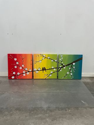 Conjunto de tres cuadros decorativos pintados a mano con técnica acrílica. Cada pieza presenta un diseño de ramas con flores blancas y pájaros, sobre un fondo degradado de colores vibrantes. - Pintura acrílica sobre lienzo. - Diseño de flores y pájaros. - Fondo degradado de rojo, amarillo y verde.