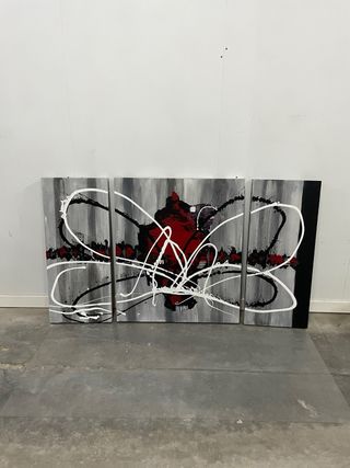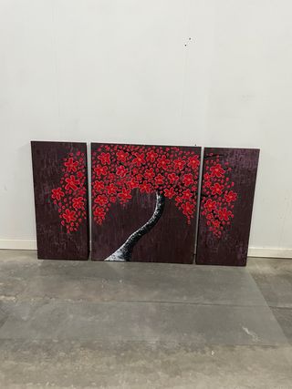 Conjunto de tres cuadros decorativos con un diseño de árbol y flores rojas. - Pintura acrílica sobre lienzo. - Tonos marrones y rojos vibrantes. - Ideal para añadir un toque de color a cualquier espacio.