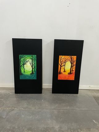 Dos cuadros decorativos con paisajes pintados en acrílico. - Uno con tonos verdes y otro con tonos anaranjados. - Ideales para dar un toque de color a cualquier espacio.