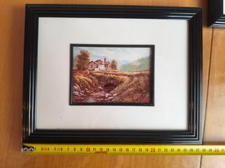 Preciosos cuadros que representan paisajes rurales con casas. 15€ cada uno, los 2 por 25€ Medidas exterior Cuadro 27.5x21.5 Lamina 12.5x9 - Tonos marrones y verdes predominantes. - Marco negro incluido.