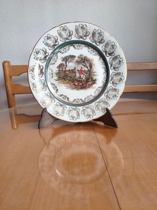 Precioso plato decorativo con un diseño de caza. - Borde con detalles dorados y verdes. - Escena central de caza con caballos y perros. - Motivos florales en el borde exterior.