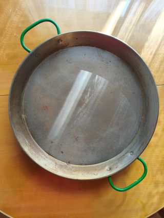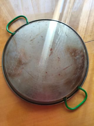 Paellera redonda con asas para cocinar. - 43 centimetros diametro - Superficie metálica. - Asas de color verde.
