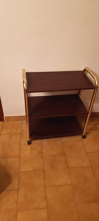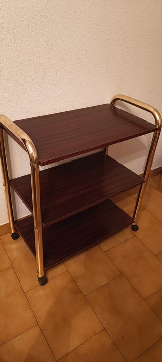 Práctica mesa auxiliar con un diseño moderno y funcional. Sus ruedas facilitan su movilidad. - Acabado en madera oscura. - Estructura metálica dorada. - Tres niveles de almacenamiento.