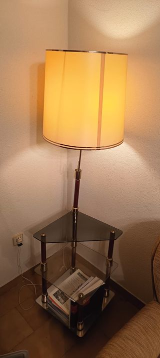 Elegante mesa auxiliar de esquina con un diseño moderno y funcional. Perfecta para aprovechar espacios. - Incluye lampara - Estructura de metal y madera. - Superficies de cristal. - Diseño triangular.