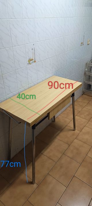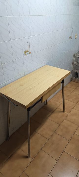 Mesa de cocina con un diseño moderno y funcional. Su superficie de madera clara y patas plateadas le dan un toque elegante. - Extensible para mayor espacio. - Estructura robusta de metal. - Tablero de madera.