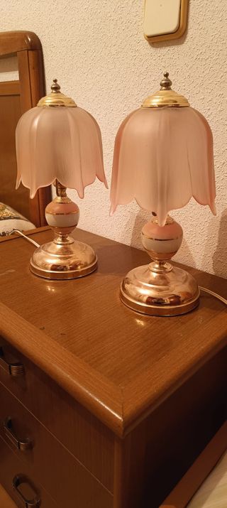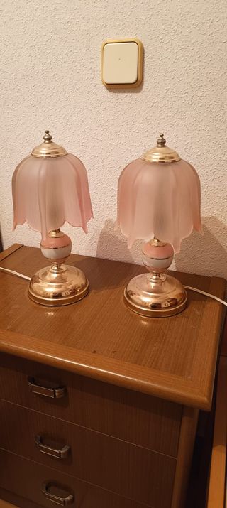 Conjunto de dos lamparitas de mesita con un diseño elegante. - Base y detalles metálicos dorados. - Pantallas de cristal rosa con acabado satinado. - Cuerpo central con detalles en blanco y rosa.