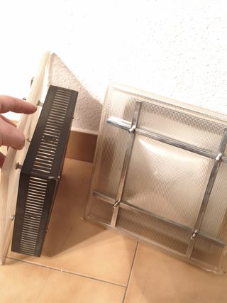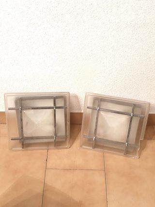 Lámpara de diseño cuadrado con acabados en cristal y metal. - UNA DE ELLAS TIENE EL CRISTAL UN POCO ROTO EN UN BORDE - Estructura metálica. - Panel frontal con rejilla. - Difusor de luz texturizado.