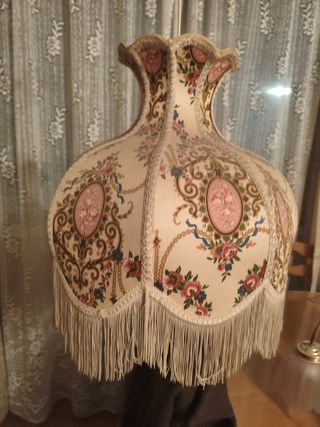 Elegante lámpara de techo con un diseño floral clásico. Su pantalla de tela aporta un toque cálido y acogedor a cualquier estancia. - Diseño con motivos florales en tonos beige y multicolor. - Acabado con flecos en la parte inferior. - Borde superior decorado con pasamanería.