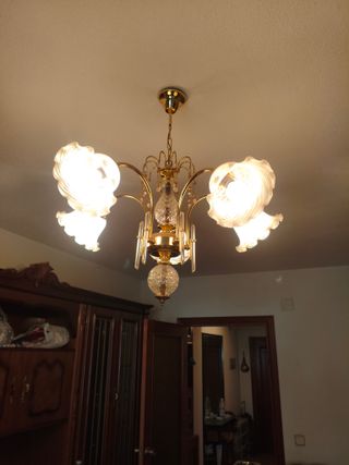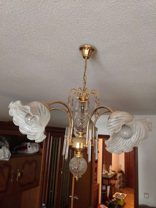 Elegante lámpara de techo con un diseño clásico y sofisticado. - Estructura principal en metal dorado. - Detalles en cristal transparente. - Pantallas de cristal con un diseño ondulado.