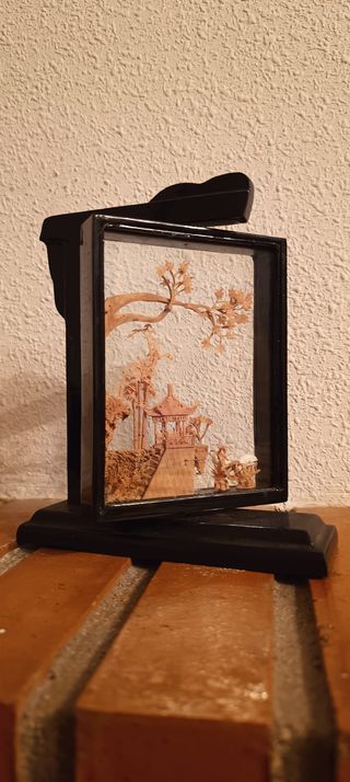 Precioso cuadro con escena oriental tallada en corcho y madera. - Marco negro. - Detallada escena con pagoda y árbol. - Base para exposición.
