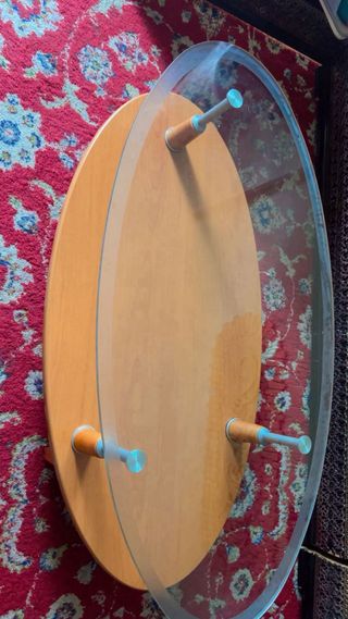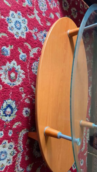 Elegante mesa de centro con sobre de cristal y base de madera. - Diseño moderno y funcional. - Combina materiales de calidad.