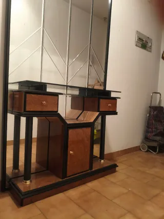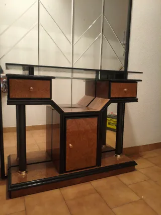 Elegante mueble recibidor con espejo. Su diseño combina a la perfección con cualquier estilo de decoración. - Se puede vender espejo y mueble por separado - Espejo 108x205 - Mueble 98 ancho x 24.5 fondo x 81.5 alto - Acabado en madera. - Superficie de cristal. - Cajones y puerta para almacenamiento.