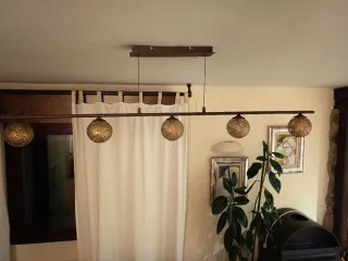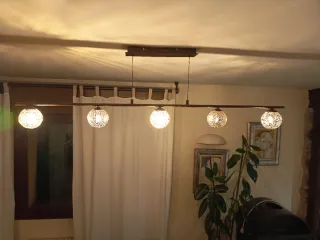 Elegante lámpara colgante con un diseño moderno y original. Su estructura combina materiales de calidad para un acabado sofisticado. - Diseño lineal con cinco puntos de luz. - Pantallas esféricas con detalles intrincados. Se puede bajar dedesde la base del techo. - Base de madera oscura.