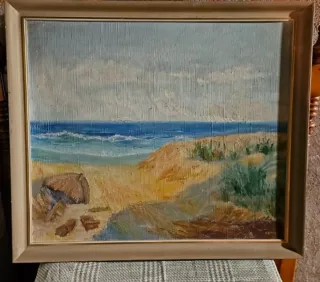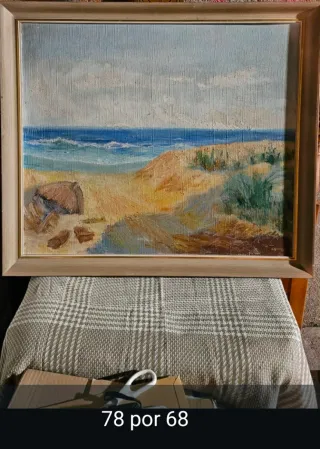 Pintura al óleo de una escena de playa con dunas y el mar. - Tonos cálidos y azules. - Textura del lienzo visible. Lo puedo acercar a Ávila, Escorial, Villalba o Madrid o zonas cercanas. Preguntar