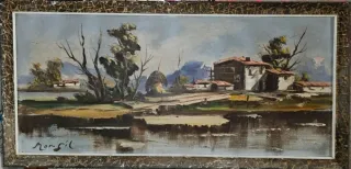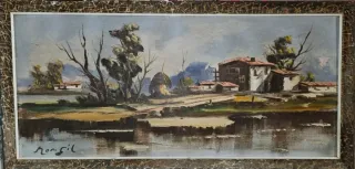 Pintura de paisaje rural con tonos azules y marrones. - Marco con diseño de mármol. - Firma del artista 'Ronsil' en la parte inferior izquierda. Lo puedo acercar a Ávila, Escorial, Villalba o Madrid o zonas cercanas. Preguntar