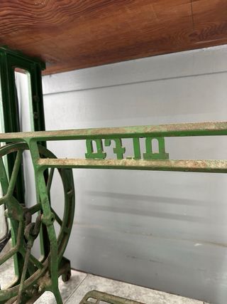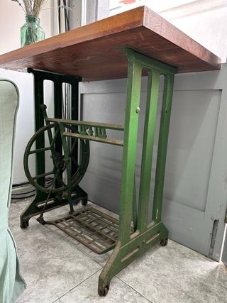 Mesa auxiliar con un diseño industrial único, combinando una superficie de madera maciza con una robusta base de metal. - Pie original de máquina de coser Alfa. - Encimera de madera con veta marcada. - Base de metal pintada en verde.