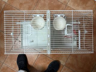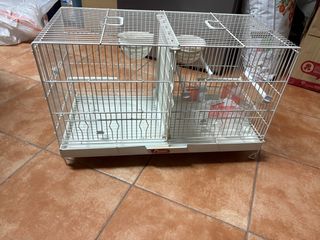 Jaula para cría de canarios o pájaros pequeños, con divisiones para separar parejas. PRECIO NEGOCIABLE - Dimensiones (largo x fondo x alto): 60 x 26 x 38,5 cm - Incluye separador central. - Bandeja extraíble para facilitar la limpieza. - Dos comederos/bebederos. - Dos perchas.