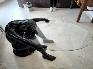 Original mesa de centro con una base escultural en forma de figura humana. - Diseño moderno y llamativo. - Tablero de cristal circular. - Base de figura humana en acabado negro brillante.