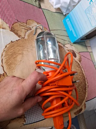 Lámpara de luz colgante con un diseño práctico y funcional. Ideal para iluminar espacios de trabajo o exteriores. - Estructura metálica protectora. - Cable de alimentación de color naranja. - Bombilla de cristal visible.