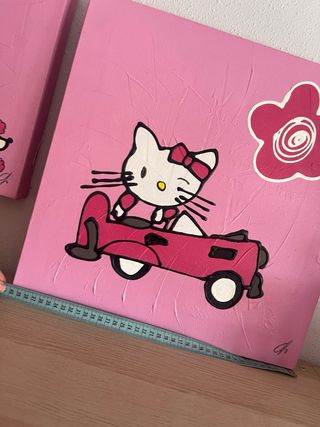Conjunto de dos cuadros decorativos con la temática de Hello Kitty. Ideales para añadir un toque divertido a cualquier habitación. - Diseño de Hello Kitty con un perrito. - Diseño de Hello Kitty en un coche rosa. - Fondo en tono rosa.