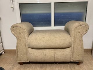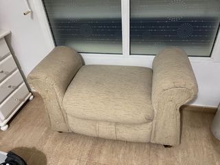 Acogedor sofá de tela en tono beige. Su diseño compacto lo hace ideal para espacios reducidos o zona de lectura. Es muy cómodo y esta en buen estado - Tapicería de tela. - Color beige neutro. - Estructura robusta.