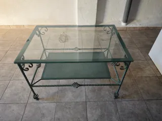 Elegante mesa con estructura de hierro forjado y tapa de cristal. - Diseño de forja. - Estante inferior de rejilla metálica. - Patas con detalles decorativos.