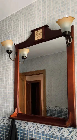 Elegante espejo con marco de madera y detalles decorativos. - Marco de madera con acabado en tono marrón. - Adorno central con diseño floral. - Dos apliques de luz integrados en el marco.