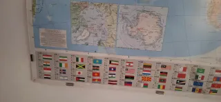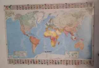 Mapa del mundo con una sección de banderas de países. Ideal para decoración o aprendizaje. - Diseño detallado del mapa. - Incluye múltiples banderas nacionales. - Enmarcacion de metraquilato.