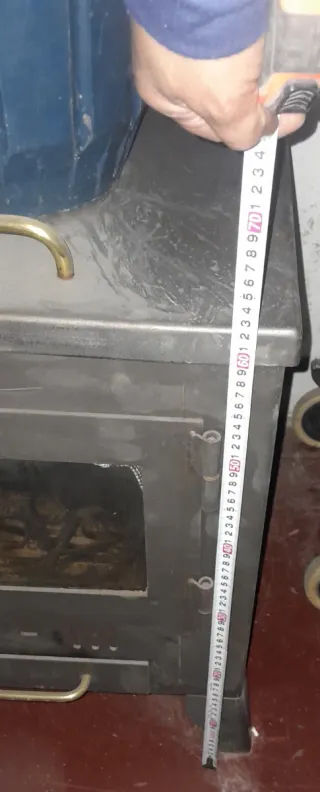 Estufa de diseño moderno con acabados en metal y cristal. - Puerta con ventana para ver el interior. - Asa dorada para abrir y cerrar puerta de leña y tapa superior de asar - palanca de regular el tiro