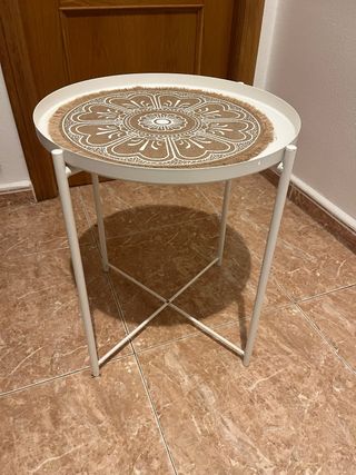 Mesilla auxiliar con un diseño moderno y funcional. Perfecta para añadir un toque decorativo a cualquier espacio. - Tablero redondo con un bonito estampado. - Patas metálicas cruzadas para mayor estabilidad.