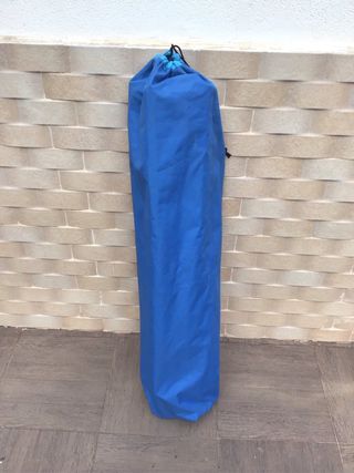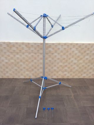 Tendedero portátil ideal para camping o exteriores. Fácil de montar y desmontar. - Estructura de aluminio. - Color azul y plateado. - Incluye piquetas para fijación.