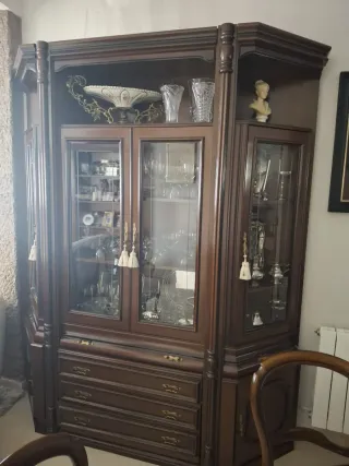 Conjunto de vitrina y aparador de estilo clásico, perfecto para dar un toque elegante a tu hogar.Vitrina color Nogal medida alto 2,20x1,80 ancho.Aparador color nogal con encimera mármol italiano medidas largo 3 m x alto 90 cm ancho 40cm y espejo con marcó nogal y espejo biselado medida largo 2,16 x 1,16 alto - Acabado en madera oscura. - Detalles dorados en los tiradores. - Puertas de cristal para exhibir tus objetos. - Cajones amplios para almacenamiento.