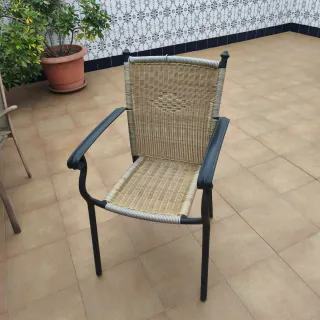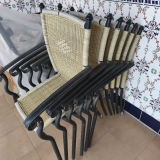 Conjunto de diez sillas de exterior, combinando dos modelos. - Estructura metálica. - Asiento y respaldo de mimbre. - Brazos en color negro.