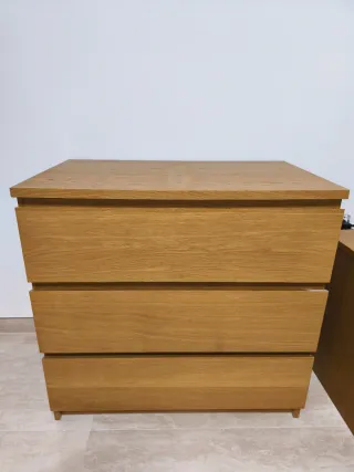 Conjunto de mesitas, cómoda y espejo de la serie MALM de Ikea. Diseño moderno y funcional. - Acabado en madera color roble. Mesitas con dos cajones. Importante saber que una de las mesitas, solamente una está oscurecida por abajo. Se puede poner en un lado pegado a la pared y la cama. (Se ve en la foto) Cómoda de 3 de cajones de la serie MALM de Ikea. Color roble. Con espejo a juego. Precio negociable.