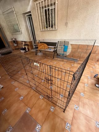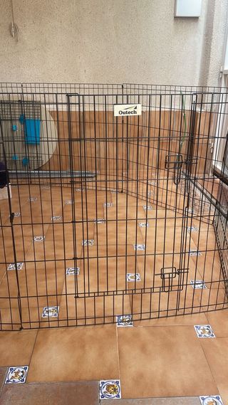 Jaula metálica para animales pequeños o medianos. Es plegable y fácil de montar. - Marca: Outech - Color: Negro y multicolor - Material: Metal La medida es de cada valla que son 8 en total una de ellas con puerta .