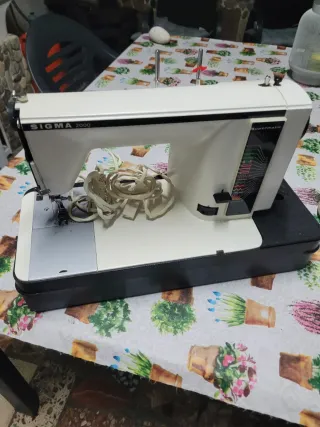 Máquina de coser Sigma 2000 en color blanco y negro. - Diseño compacto y funcional. - Incluye el cable de alimentación.