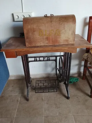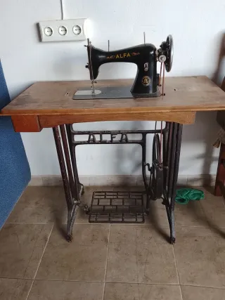 Máquina de coser Alfa de estilo vintage, con base de madera y estructura metálica. - Diseño clásico. - Ideal para coleccionistas o decoración.