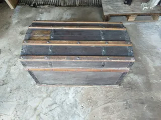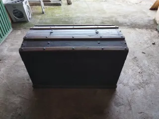 Este baúl o cofre de madera con detalles metálicos es un elemento decorativo y funcional. - Diseño robusto y clásico. - Acabado en tonos oscuros.